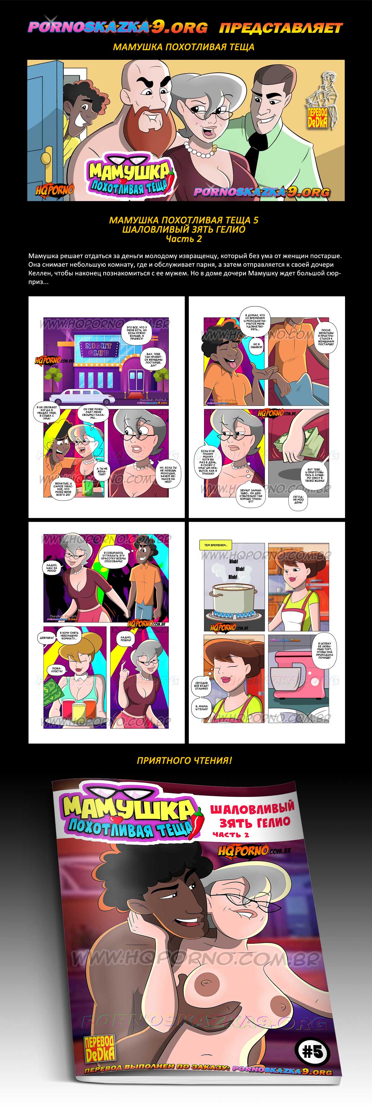 Порно комикс «Мамушка похотливая теща. Часть 5. Шаловливый зять Гелио. Часть 2.» Мамушка решает отдаться за деньги молодому извращенцу, который без ума от женщин постарше. Она снимает небольшую комнату, где и обслуживает парня, а затем отправляется к своей дочери Келлен, чтобы наконец познакомиться с ее мужем. Но в доме дочери Мамушку ждет большой сюрприз…